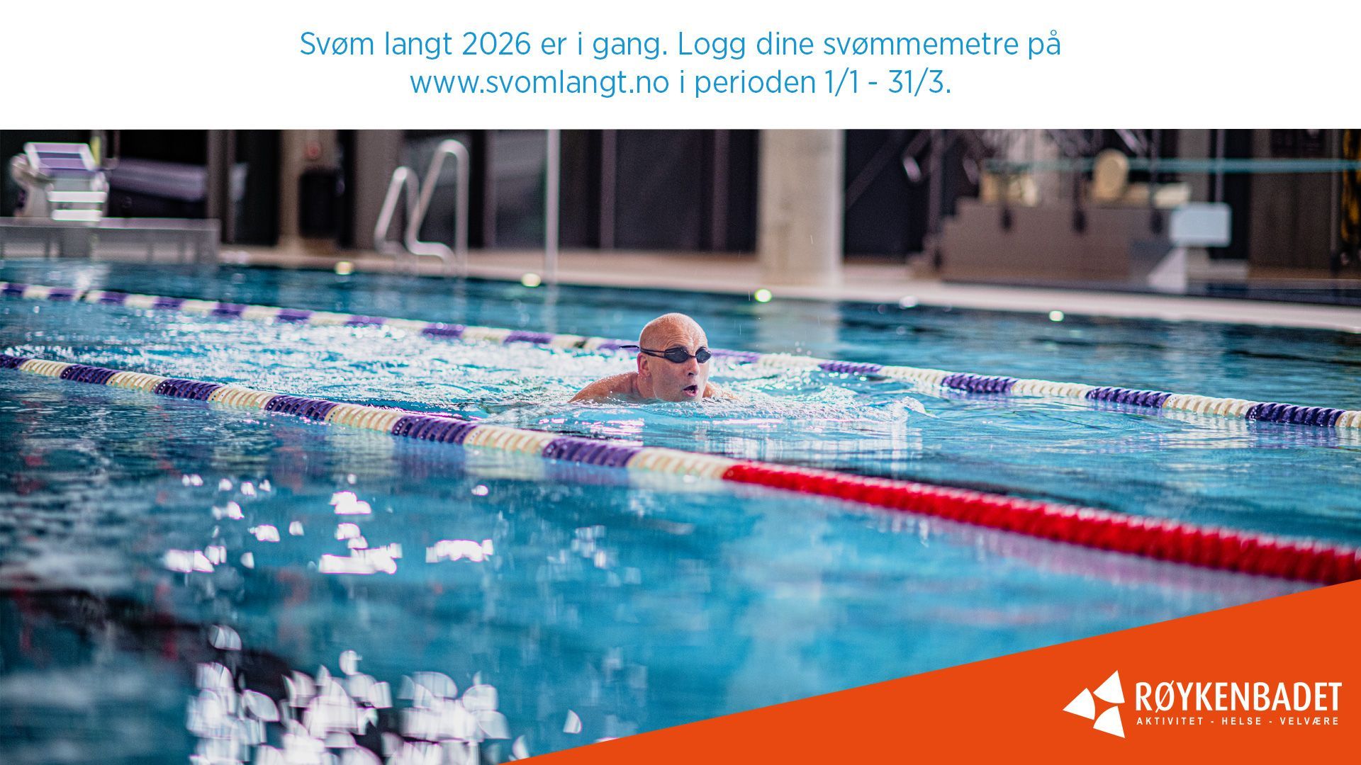 I perioden 1. januar til 31. mars arrangeres den nasjonale mosjonskampanjen Svøm langt 2026. Målet med kampanjen er å skape gode mosjonsvaner i befolkningen og motivere til bruk av svømmehallen som arena for fysisk aktivitet. Alle kan delta – uansett alder og fysiske forutsetninger. Påmelding skjer elektronisk via nettsiden til Svøm langt 2026 ( www.svomlangt.no ). Her oppretter du en personlig bruker og registrerer antall meter du har svømt. På nettsiden finner du også aktuell informasjon om kampanjen, som gruppeinndelinger, distansekrav, premiering m.m., samt kontaktinformasjon til arrangør.