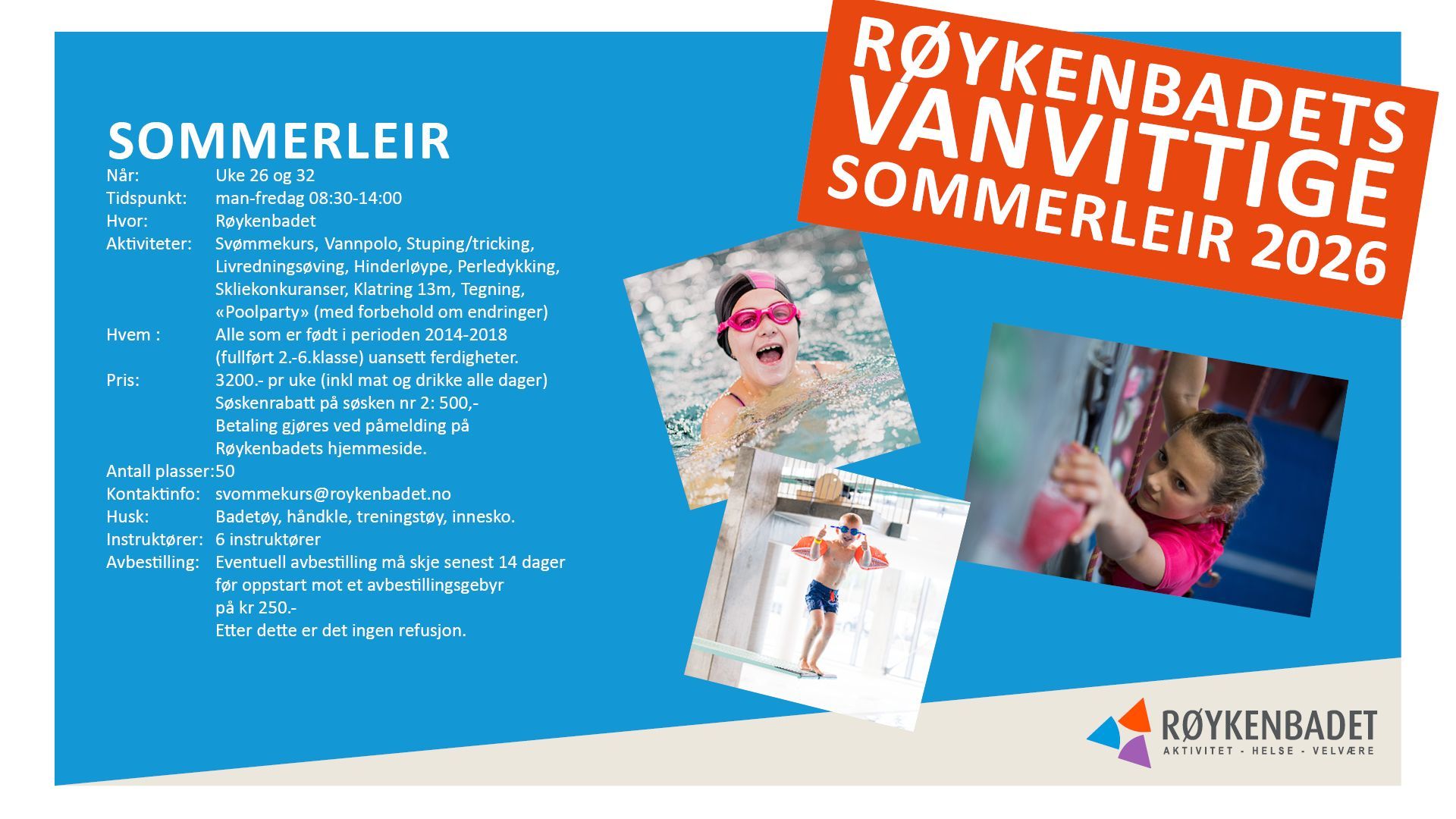 Røykenbadet arrangerer kurs for baby, barn fra 2-6 år og voksne. Påmelding til alle kurs er nå åpnet. For mer informasjon se: https://roykenbadet.goactivebooking.com/event-categories/5/events for mer informasjon og påmelding. Oppstart er i perioden 23. mars til 8. april. Førstemann til mølla gjelder for påmelding. Er kurset fult? Ta kontakt på svommekurs@roykenbadet.no . Ved stor interesse kan det bli satt opp flere kursplasser.